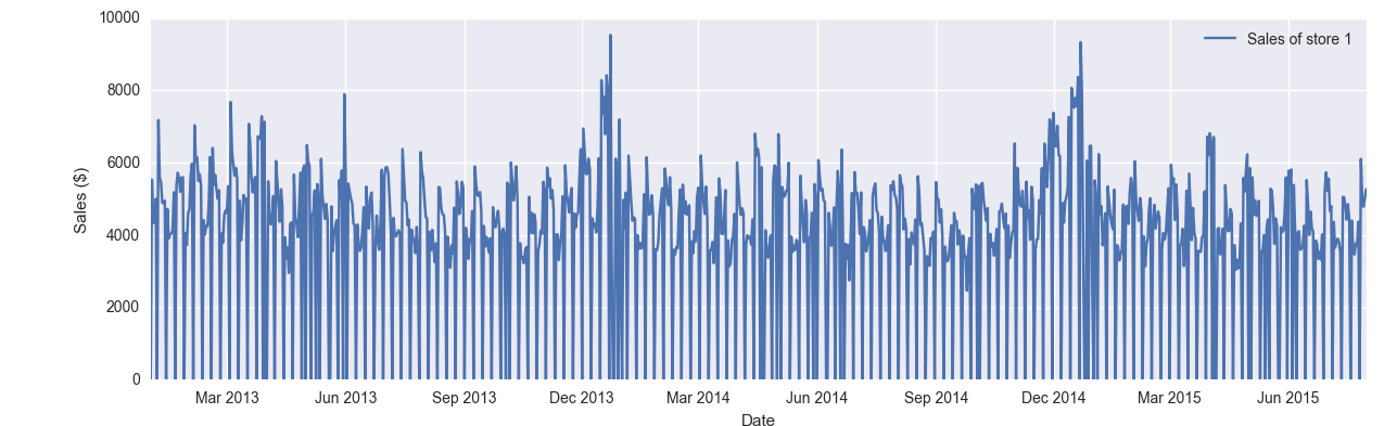 Part 2: Your notebook should use the pandas library to read in the Rossman store sales data (a CSV dataset) and plot the sales of store #1. Your plot should look something like this: