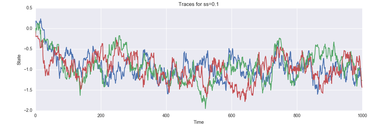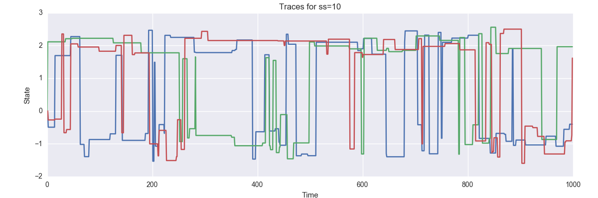 Furthermore, for each proposal distribution, you should run three independent chains (you can do these sequentially or in parallel, as you like). You should display each of these three chains on a single plot with time on the x-axis and the state on the y-axis. Ideally, you will see each of the three chains mixing between two modes; you may notice other features of the behavior of the samplers as well, which you should report in your writeup!
