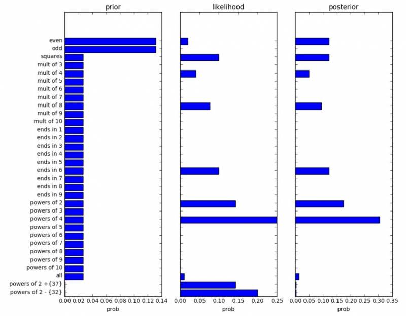 Following the Bayesian Concept Learning example in Chapter 3 of MLAPP, we're interested in reasoning about the origin of a set of numbers. We'll do this by placing a prior over a set of possible concepts (or “candidate origins”), and then use Bayes' law to construct a posterior distribution over concepts given some data.
