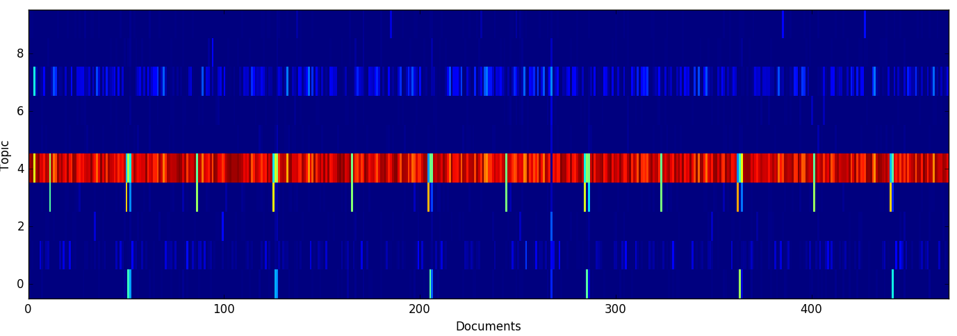 To see how documents were assigned to topics, I visualized the per-document topic mixtures as a single matrix, where color indicates probability: