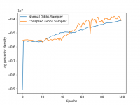 Your notebook must also produce a plot of the log posterior of the data over time, as your sampler progresses. You should produce a single plot comparing the regular Gibbs sampler and the collapsed Gibbs sampler.