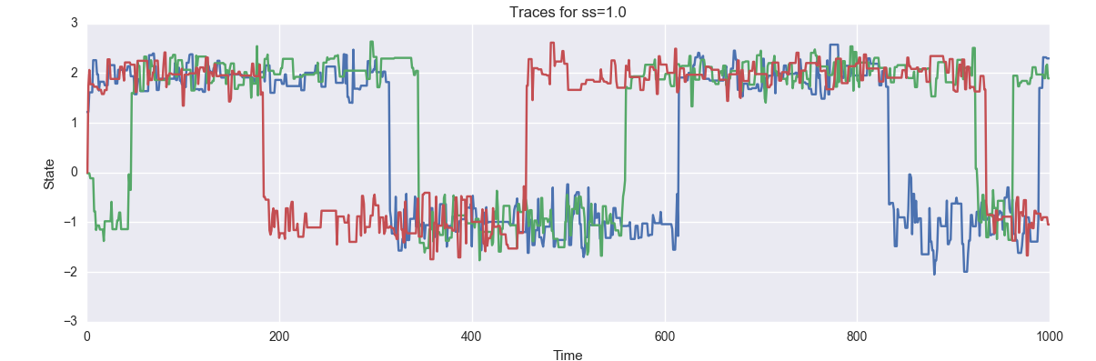 Furthermore, for each proposal distribution, you should run three independent chains (you can do these sequentially or in parallel, as you like). You should display each of these three chains on a single plot with time on the x-axis and the state on the y-axis. Ideally, you will see each of the three chains mixing between two modes; you may notice other features of the behavior of the samplers as well, which you should report in your writeup!